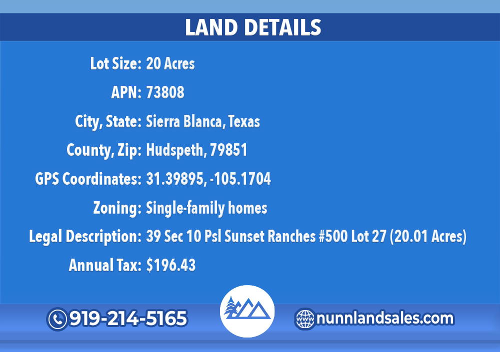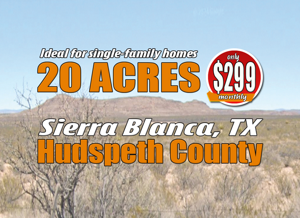 Dreaming of owning land? Look no further! We’ve got an incredible opportunity for you in Sierra Blanca, Texas. Secure 20 acres of unrestricted land in Hudspeth County for just $299 down and $299 per month. No credit check, no hassle, and it’s an unbeatable deal! Don’t miss out on this incredible opportunity!